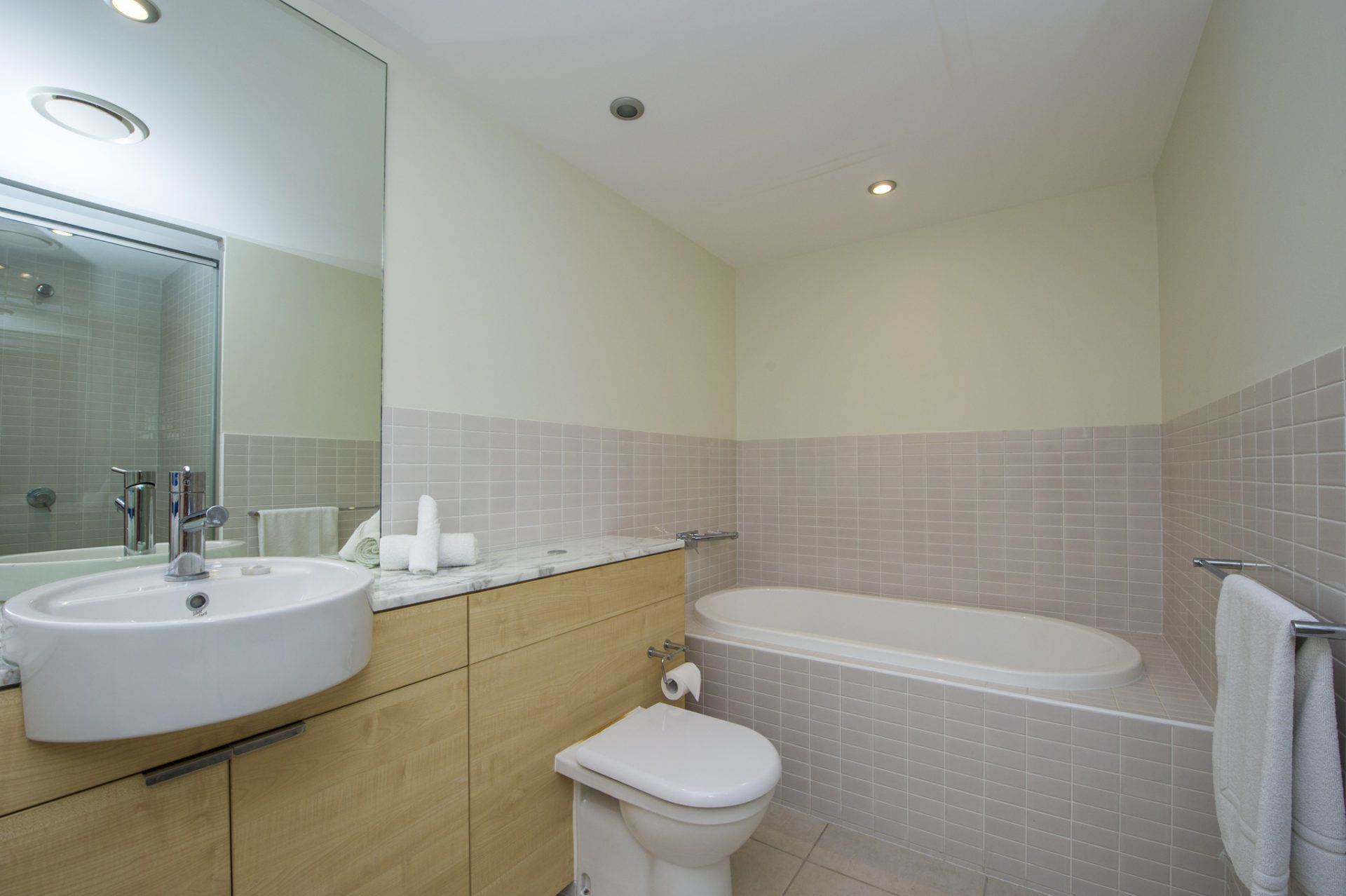The apartment has 2 bathrooms, with the main bathroom featuring a bath tub. There is a kitchen with all you need, plus laundry facilities in the apartment.