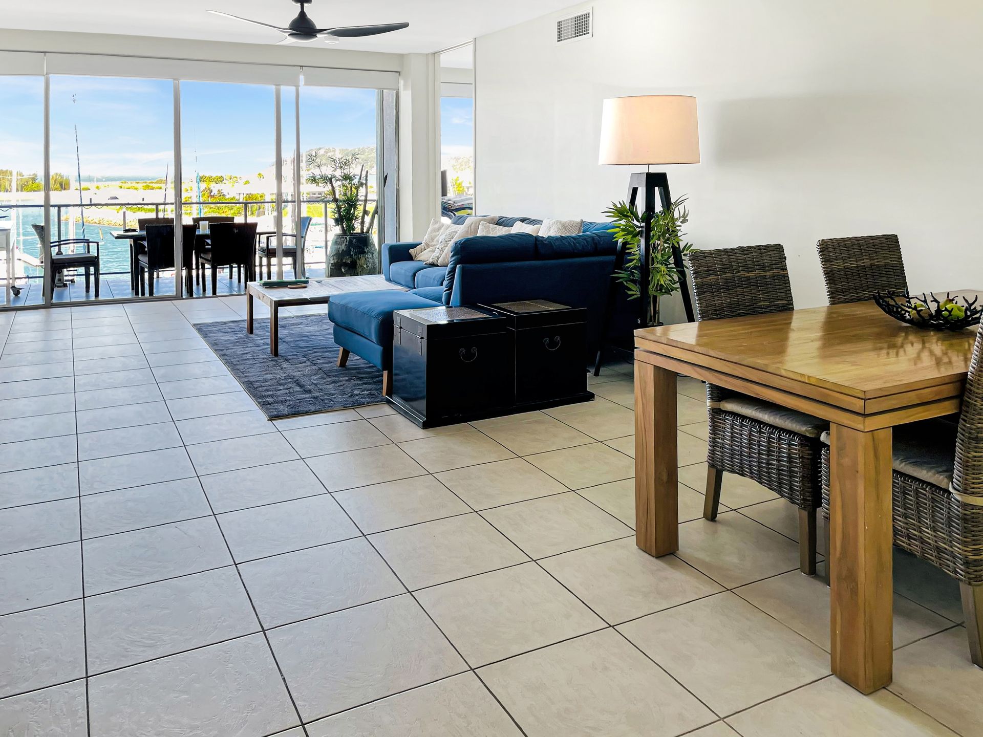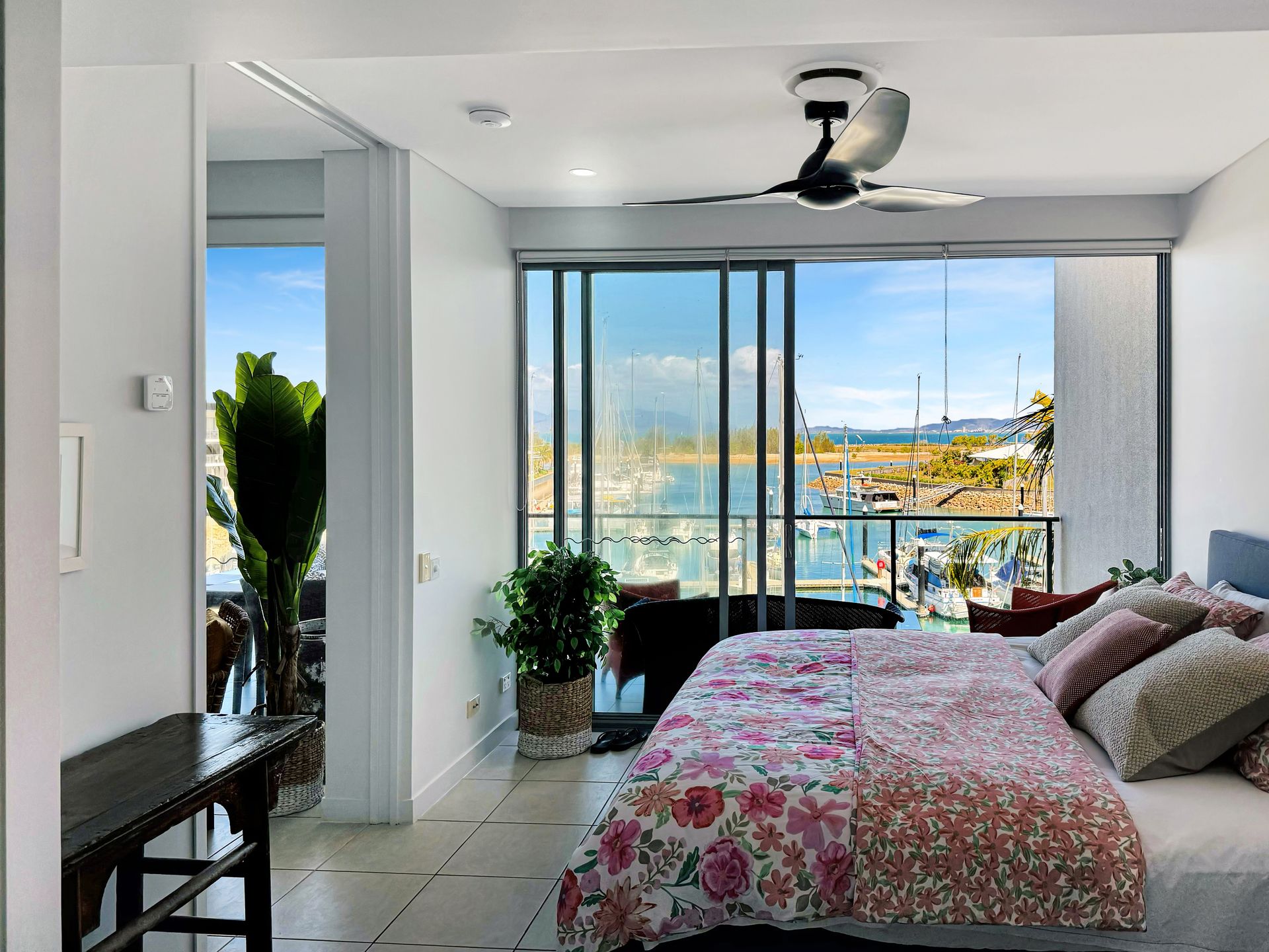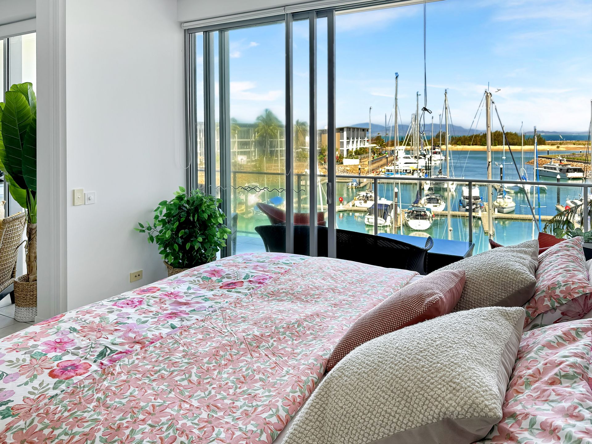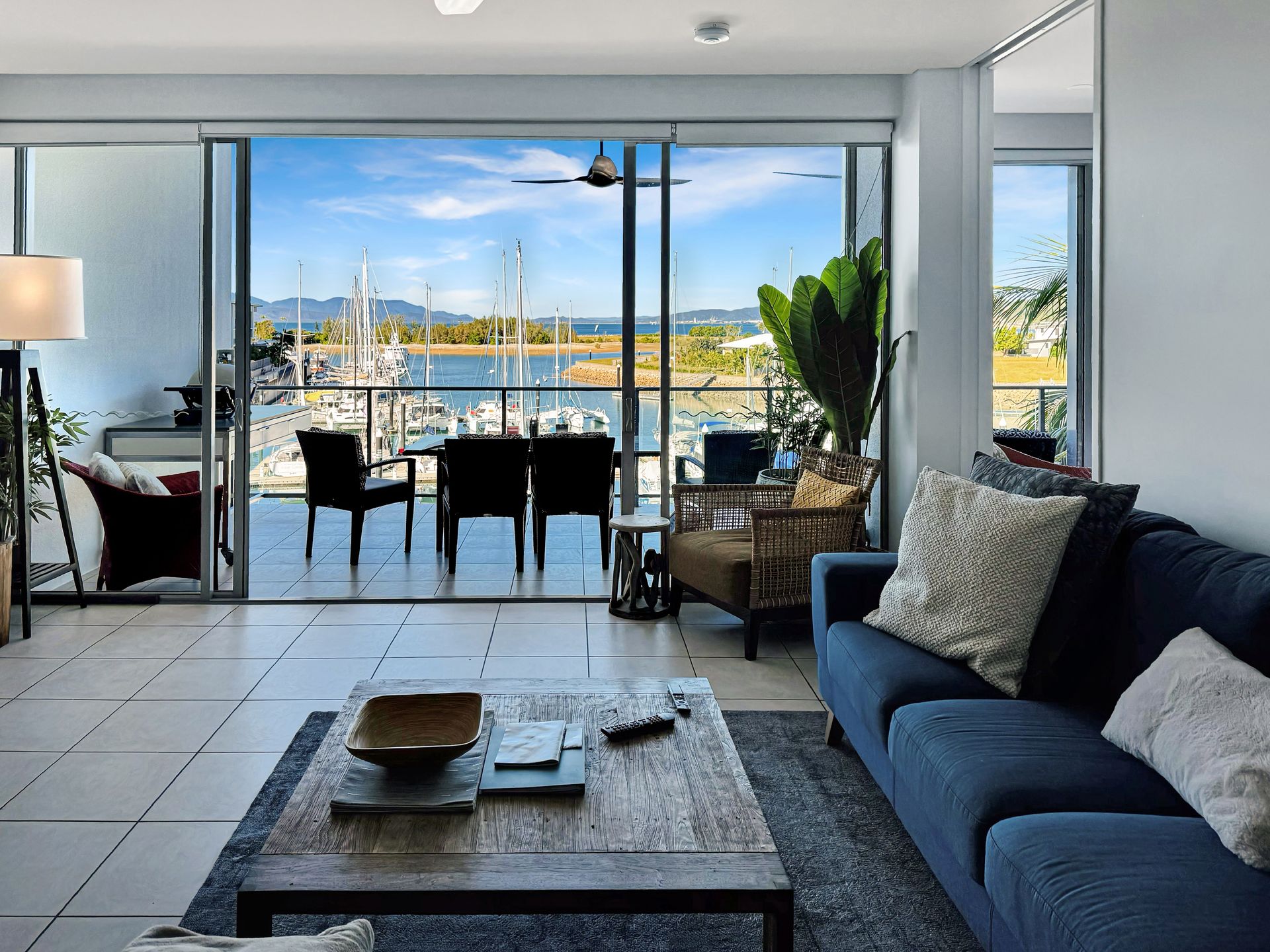 Sensational top floor 3-bedroom executive apartment in Blue On Blue Resort with its huge 100 metre lagoon pool, with commanding views over the marina and across the Coral Sea to Cape Cleveland and the twinkling lights of Townsville.