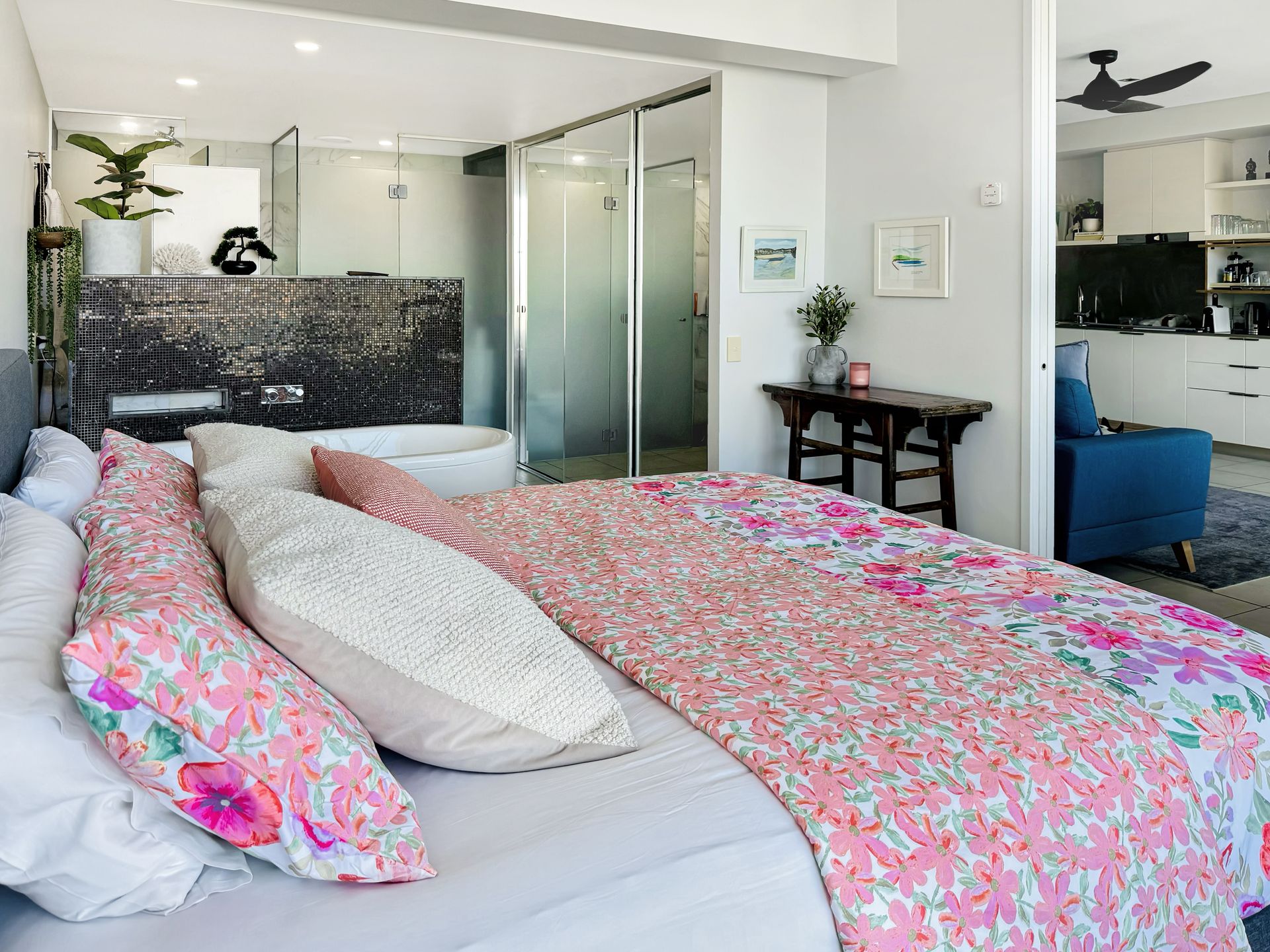 The apartment features high ceilings and floor to ceiling glass doors, two bathrooms including a resort-style ensuite to the master with spa bath. Second and third bedrooms are both generous with large mirrored built-ins. The apartment offers climate-controlled day/night air conditioning and heating, a large Smart TV in the lounge for streaming from your own accounts, and a fully self-contained kitchen with pull-out pantry, new oven, air fryer & dishwasher, icemaking machine, a microwave and Nespresso coffee machine. There’s also a full-size laundry for your convenience. Freshly painted, large new fans installed throughout, complete with comfortable beds and quality linen, this apartment truly has everything you need for a relaxing holiday.