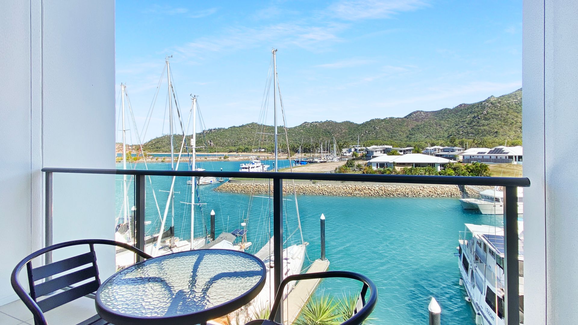 The studio has an ensuite, lounge area with TV and a private marina front balcony with outdoor setting.