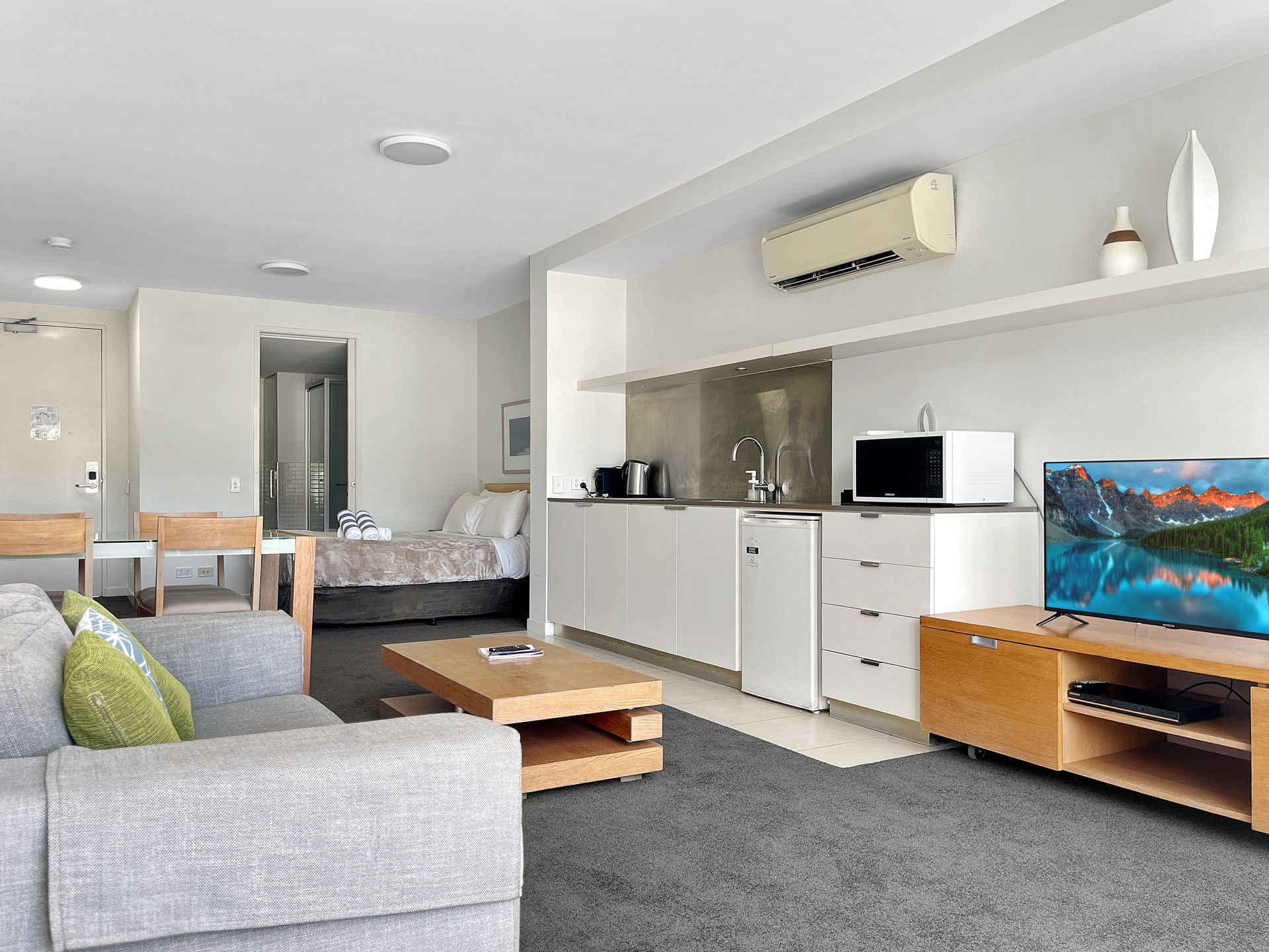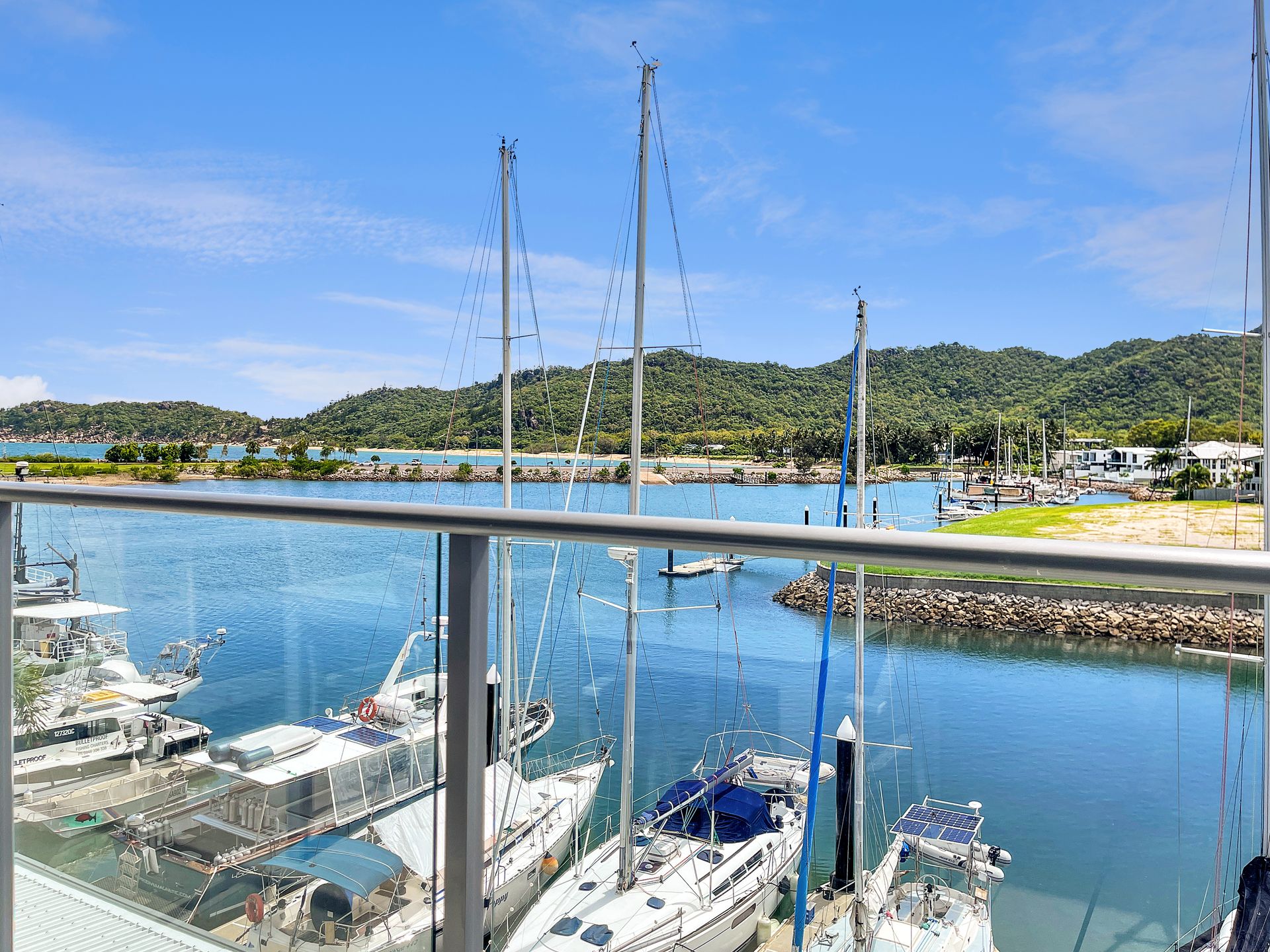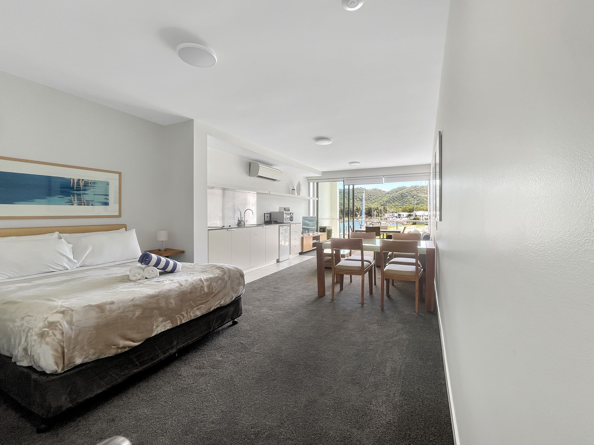 The studio has an ensuite, lounge area with TV and a private marina front balcony with outdoor setting.