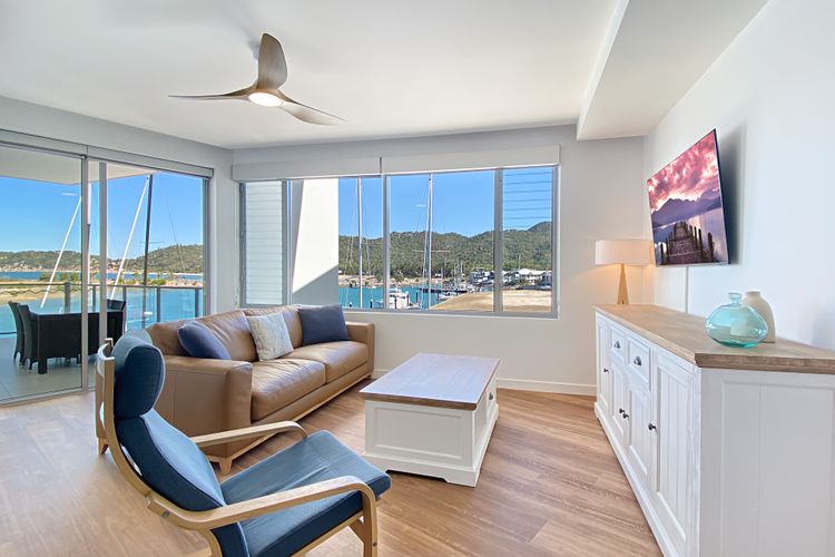 The studio has an ensuite, lounge area with TV and a private marina front balcony with outdoor setting.