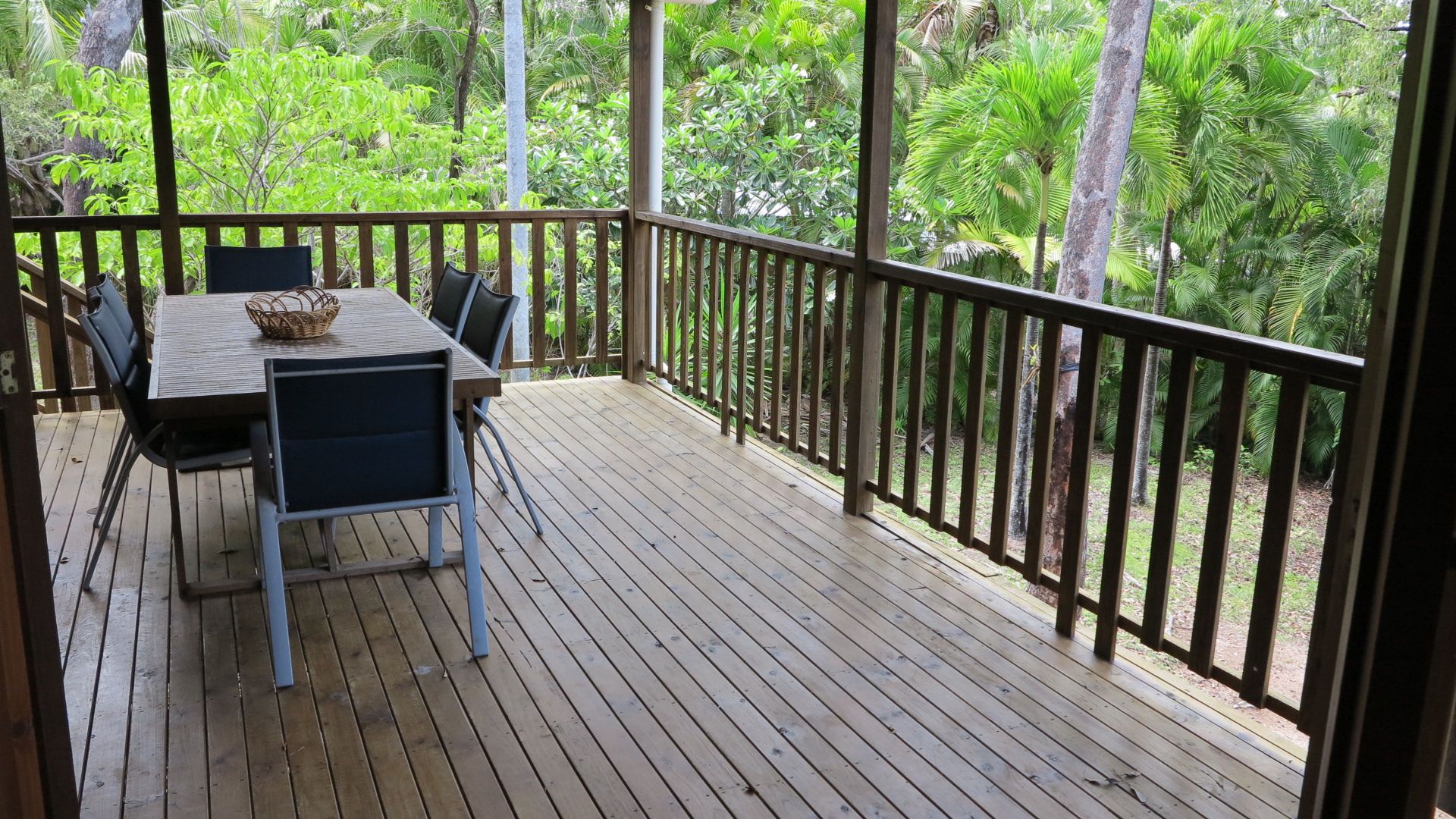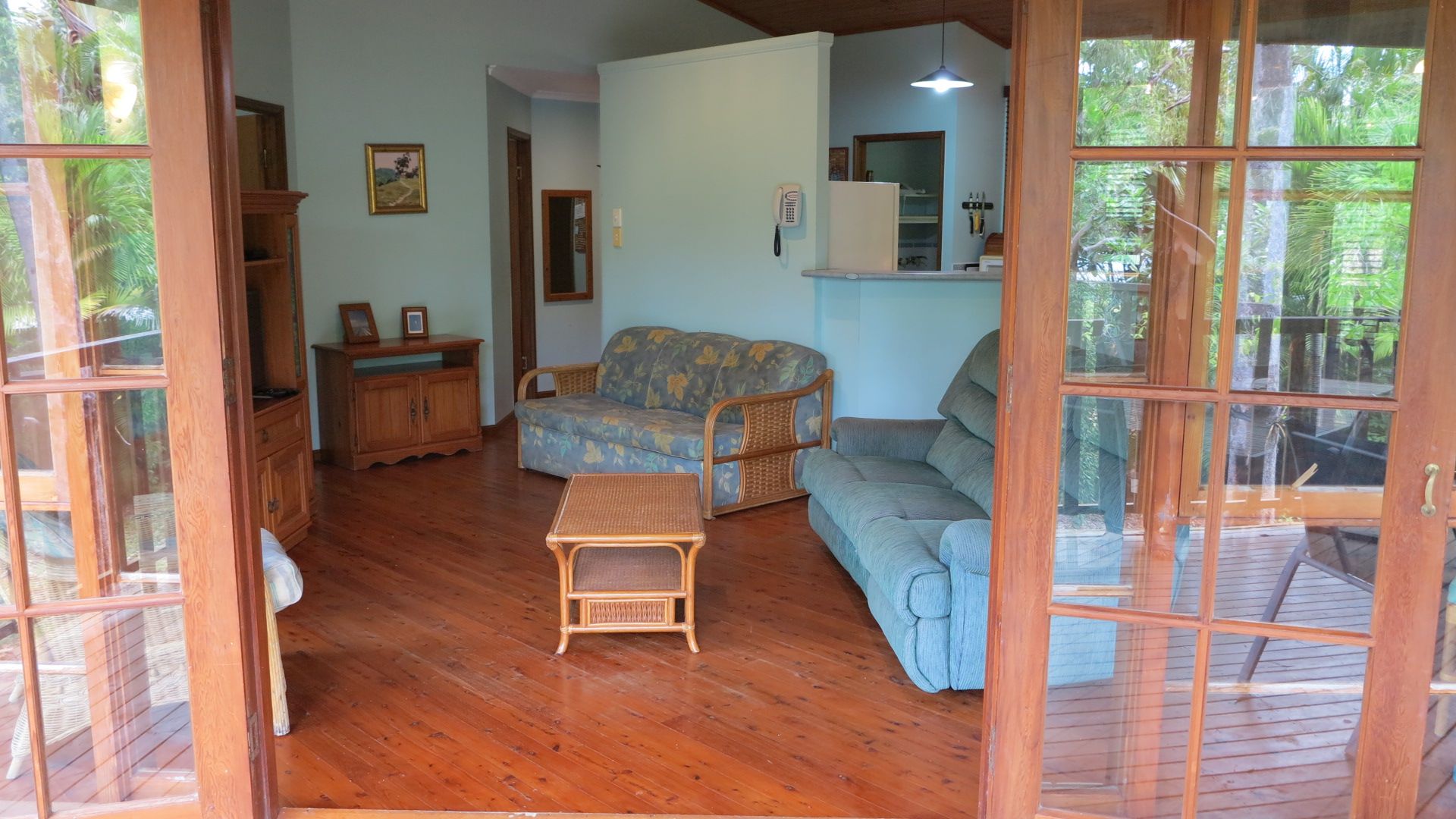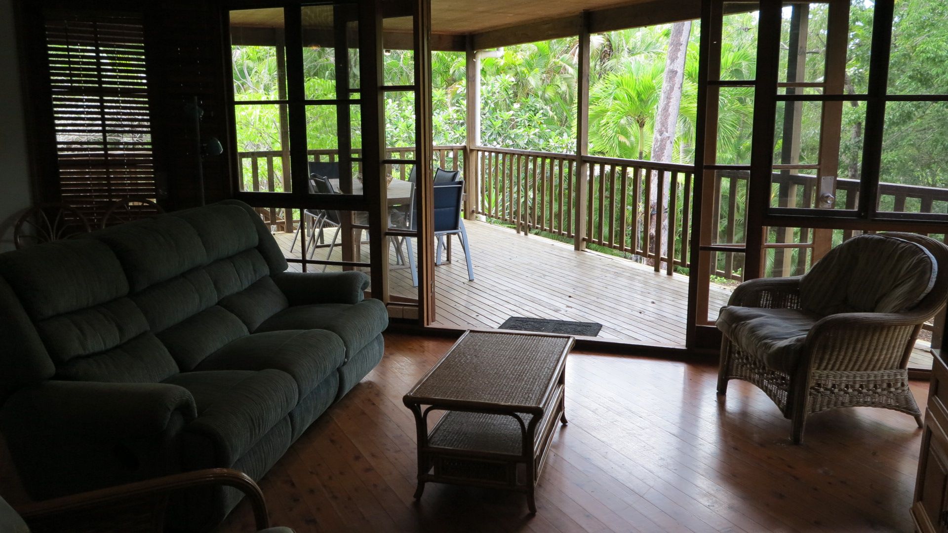 The open plan living area features French doors that open out to the deck and your private tropical outdoor dining area with BBQ that is nestled amongst the bushland.