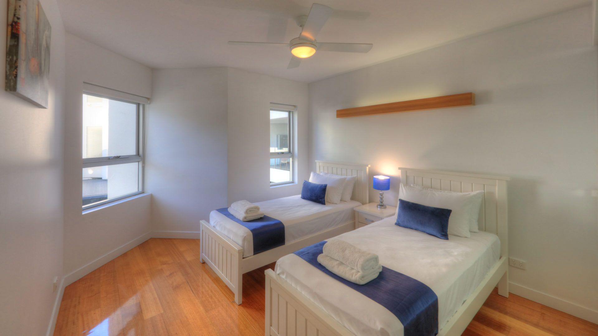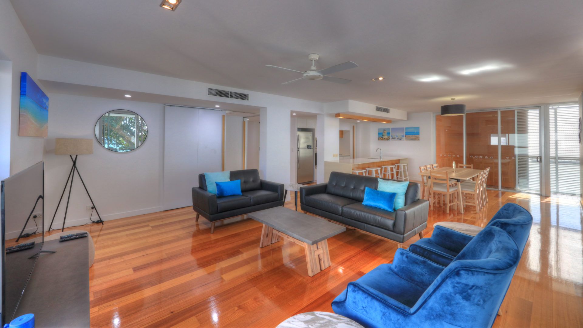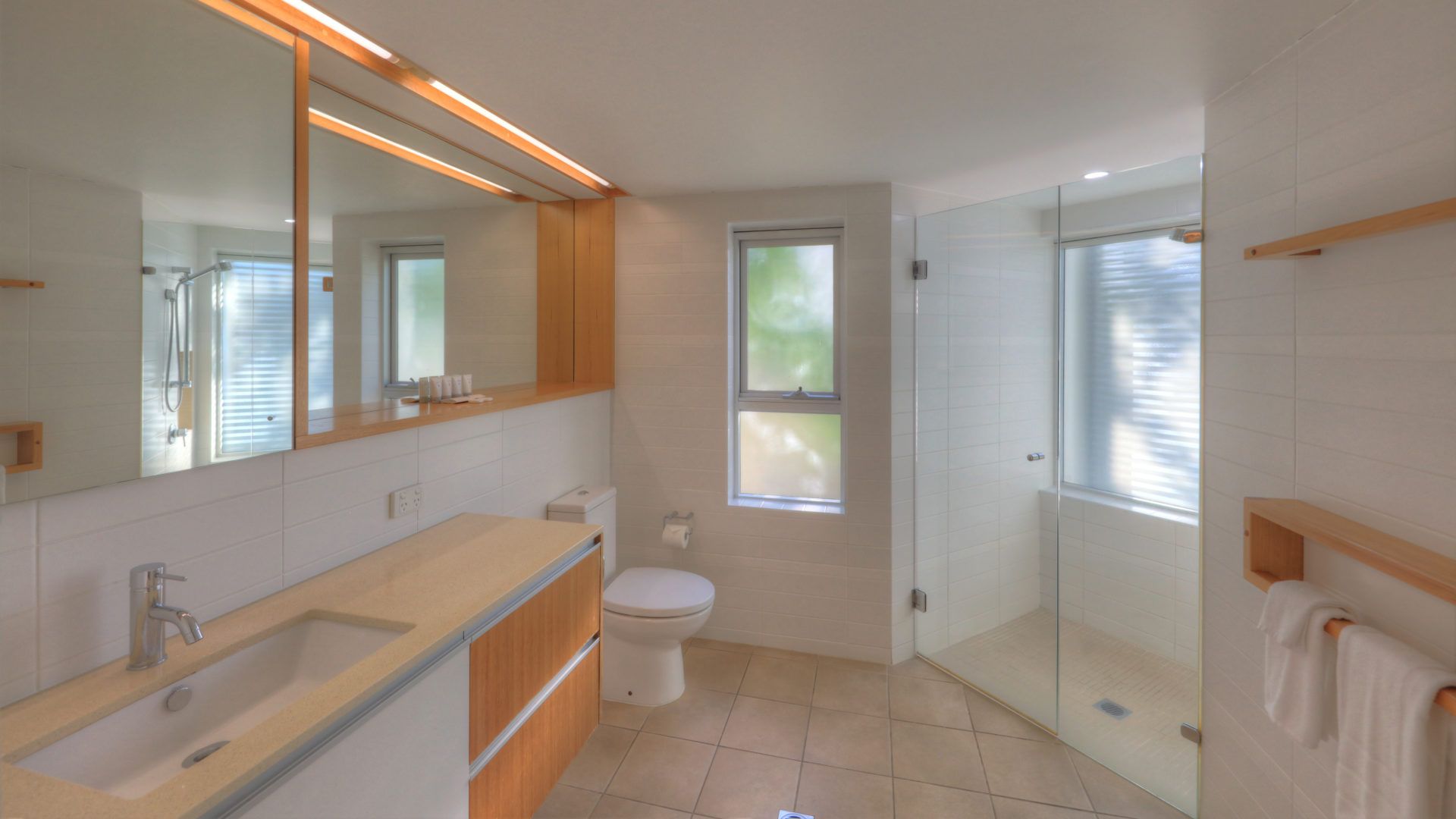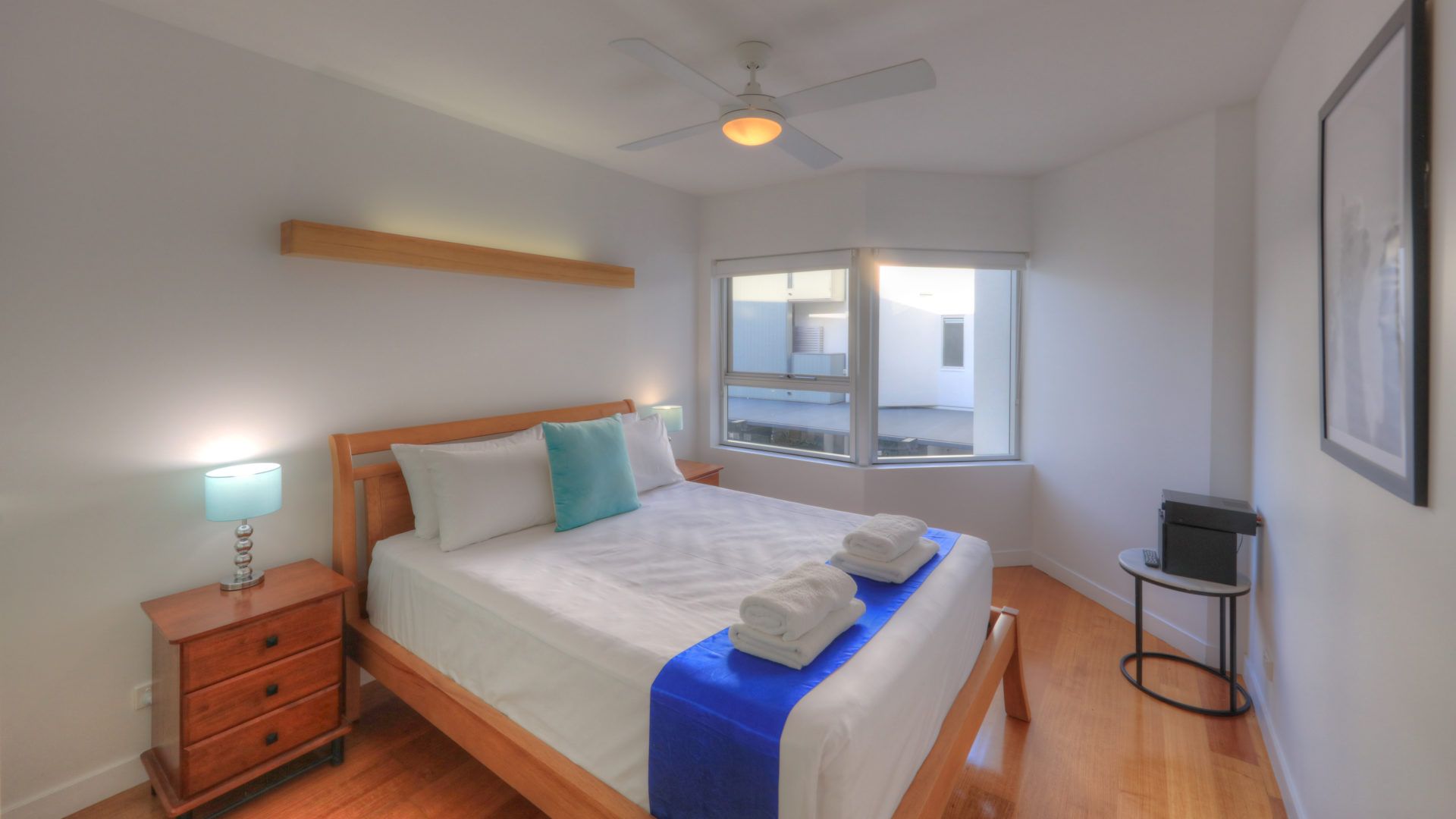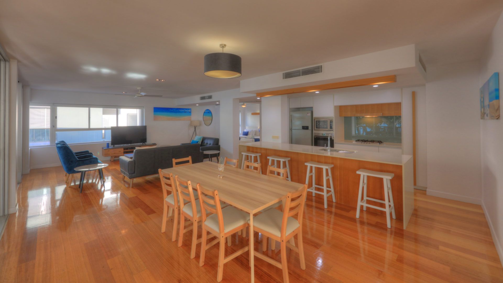 Apartment 3 is on the second level featuring 2 queen beds and 2 single beds, lovely views of the foreshore, water and mountains. This apartment features a fantastic 10mt x 3mt front balcony. There is lift access.