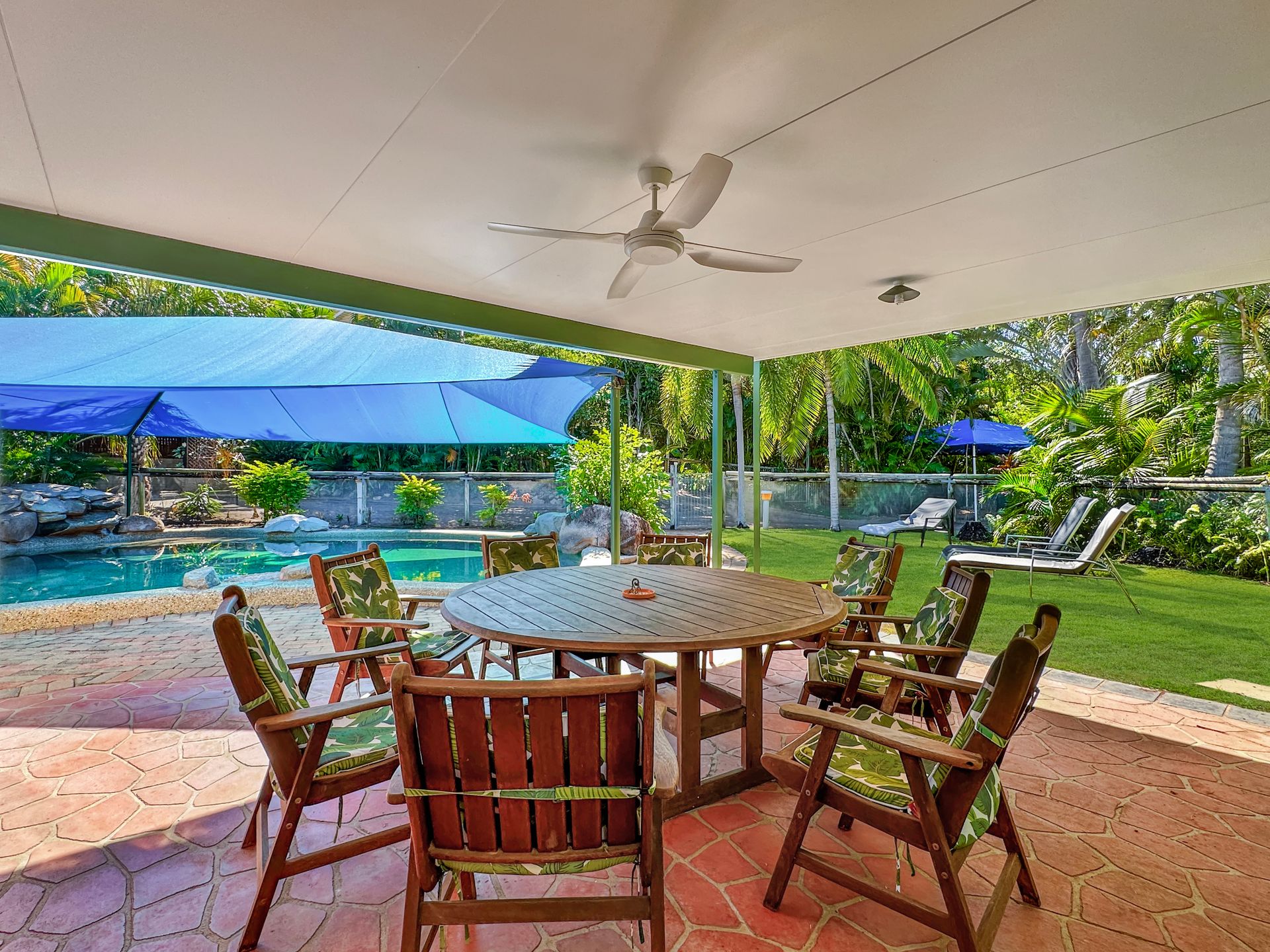 An outdoor undercover deck, equipped with outdoor lounge and dining settings.