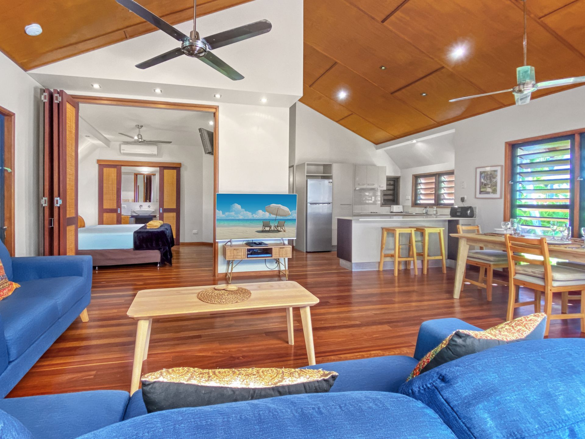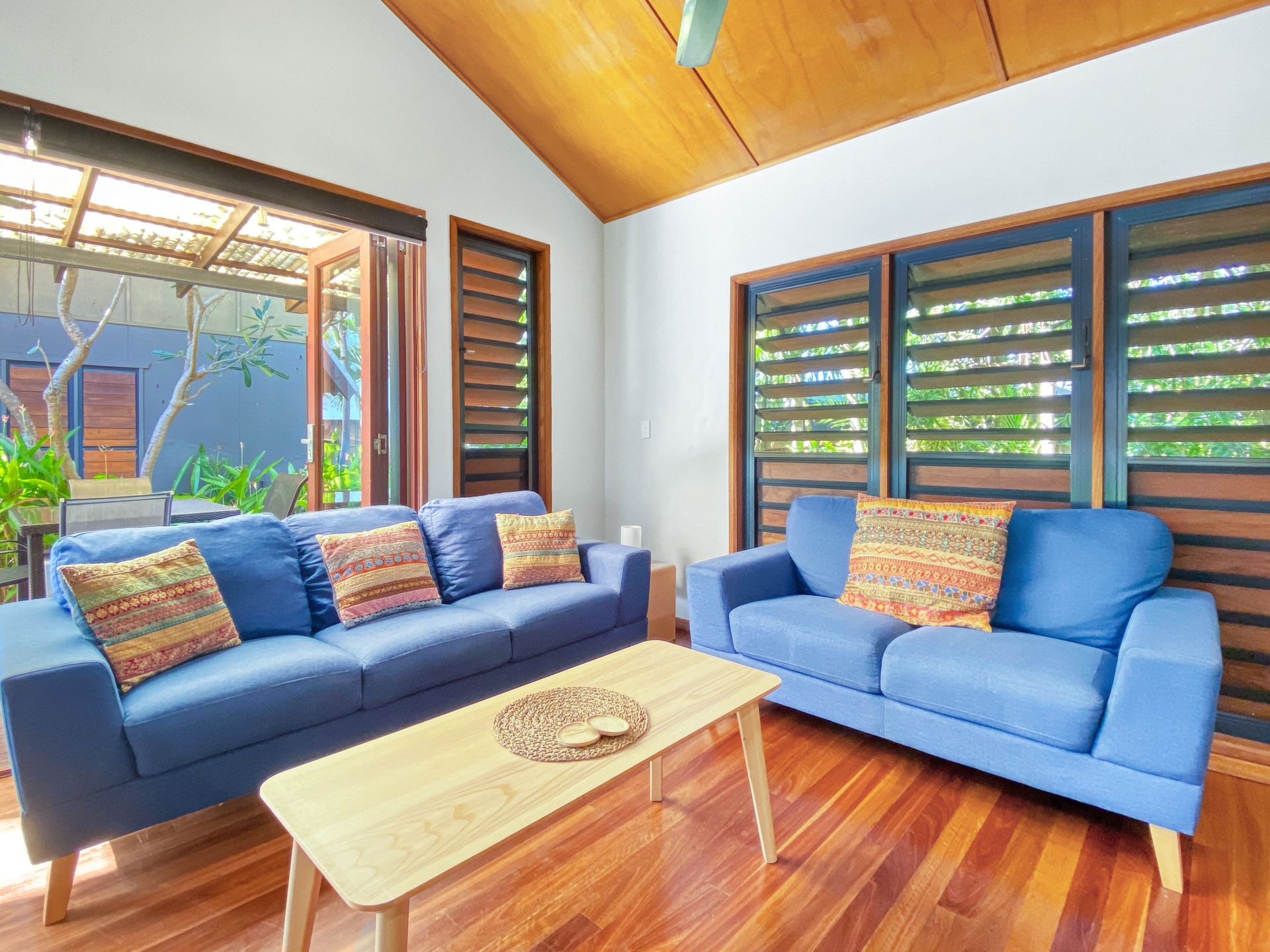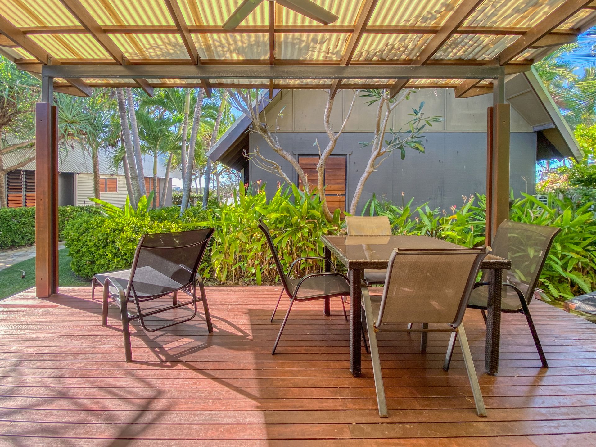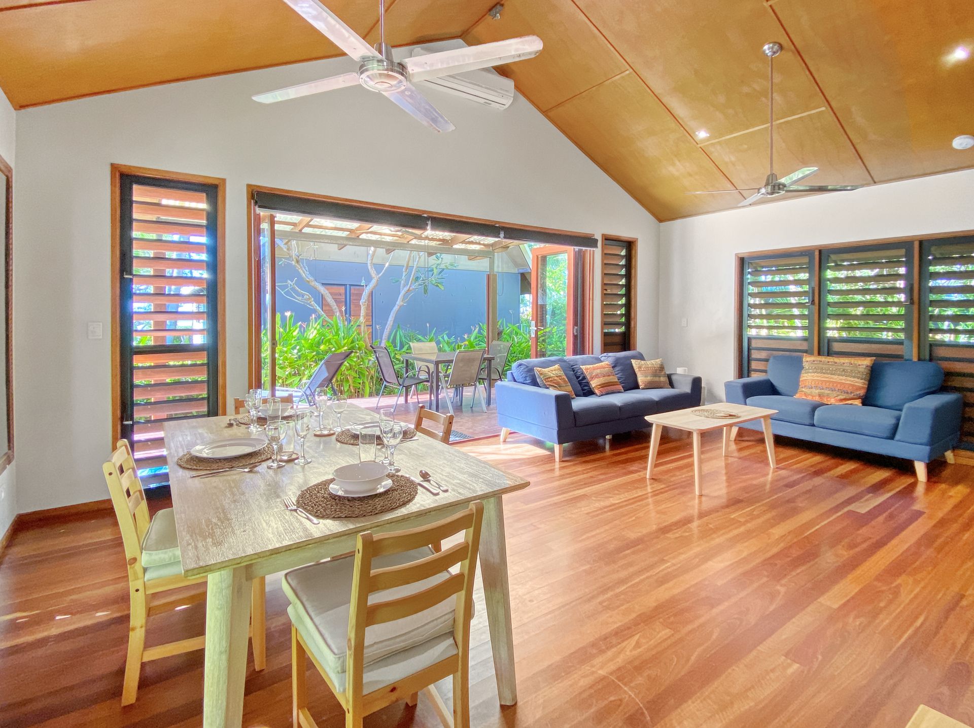 The living area has bifold panoramic doors opening on to your private covered verandah. Take the weight of the world off as you relax on cushioned lounges complete with foot stools, so you can really put your feet up. Alongside your private verandah is your own private tropical garden courtyard, featuring a four seater teak table chairs and your own private BBQ, ideal for outdoor dining or relaxing on your tropical island getaway. The villas share a swimming pool in the centre of the complex.