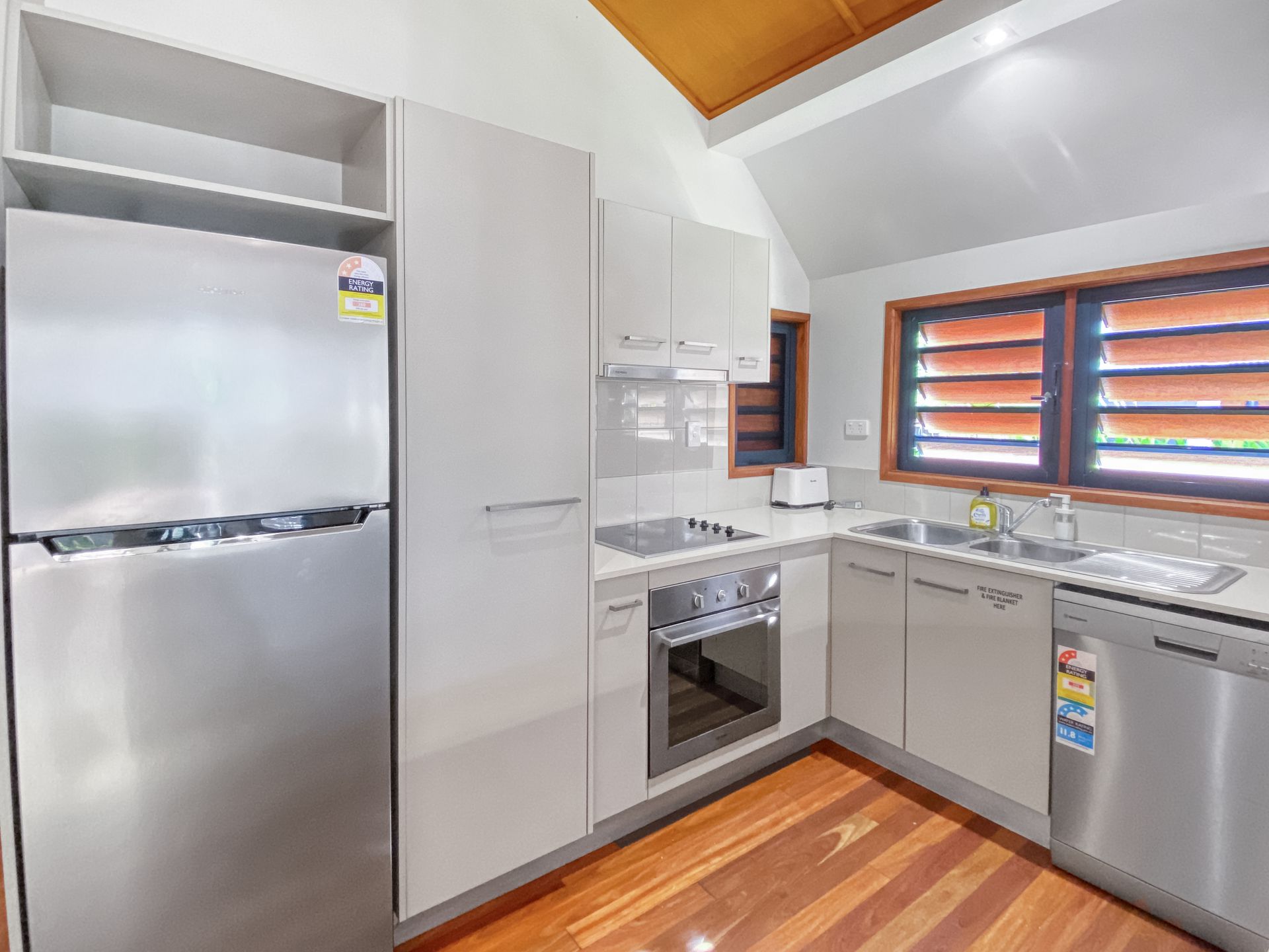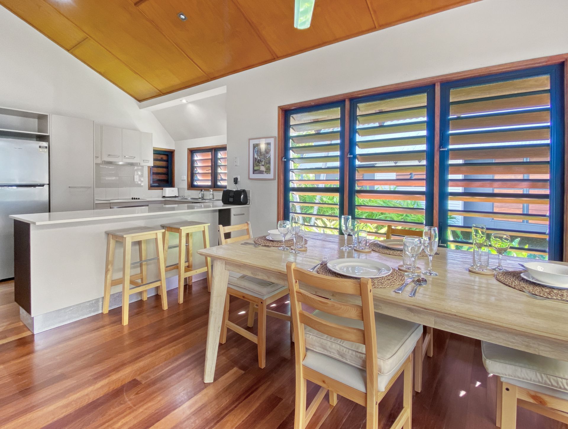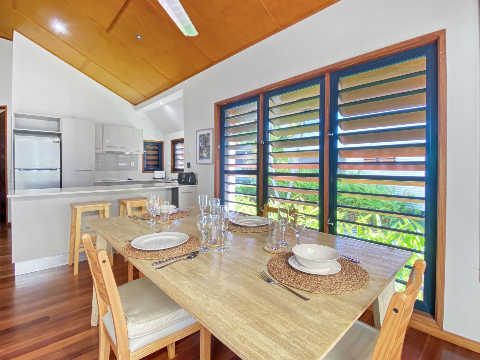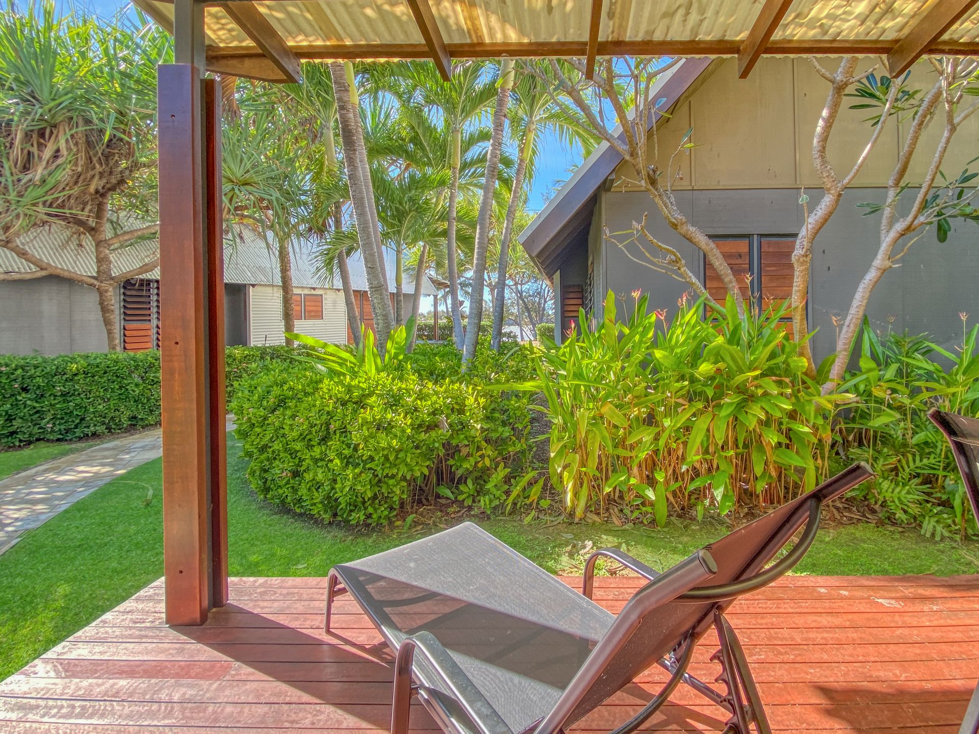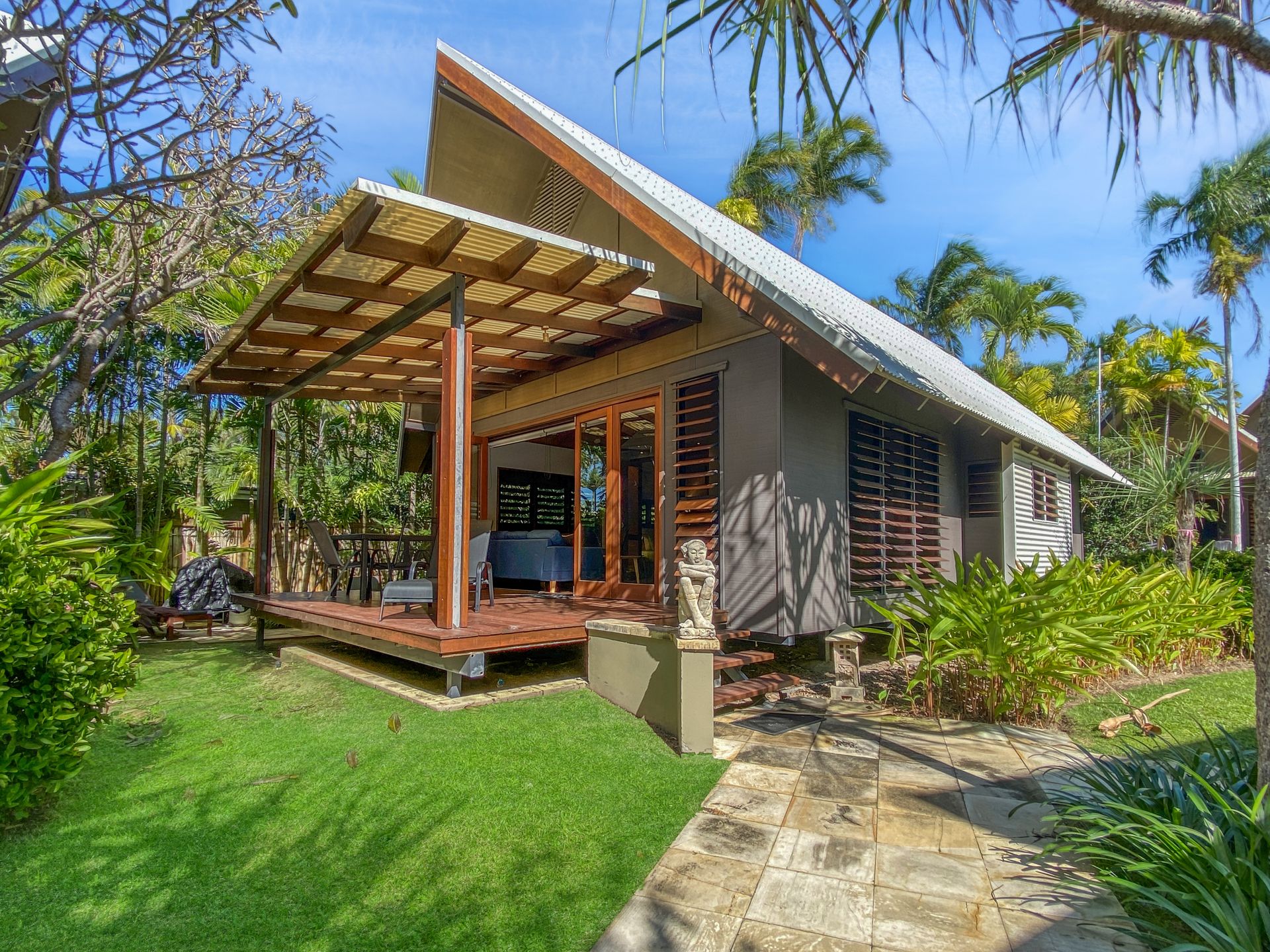 The living area has bifold panoramic doors opening on to your private covered verandah. Take the weight of the world off as you relax on cushioned lounges complete with foot stools, so you can really put your feet up. Alongside your private verandah is your own private tropical garden courtyard, featuring a four seater teak table chairs and your own private BBQ, ideal for outdoor dining or relaxing on your tropical island getaway. The villas share a swimming pool in the centre of the complex.