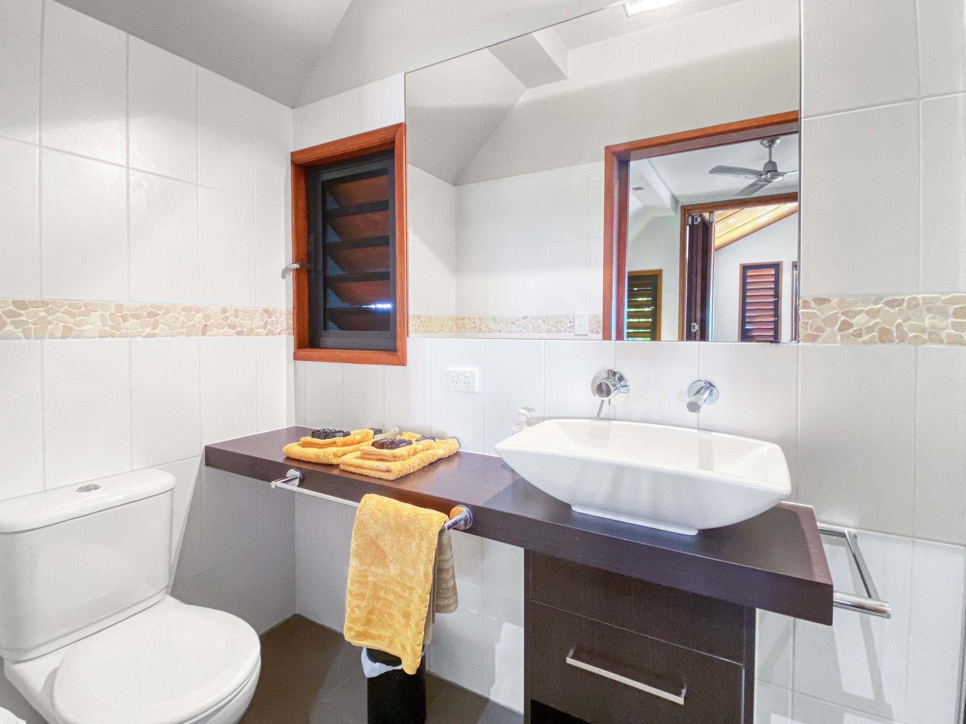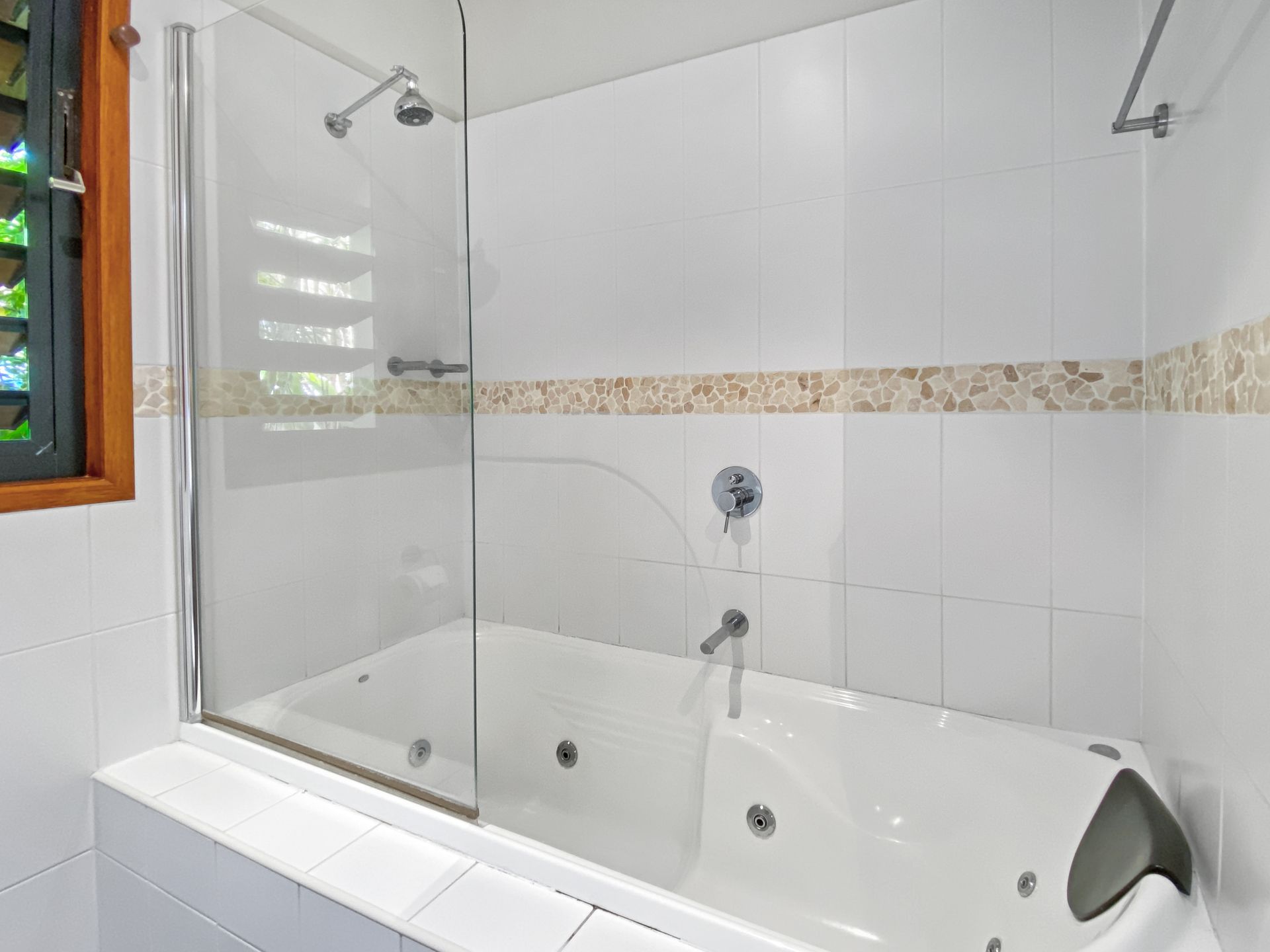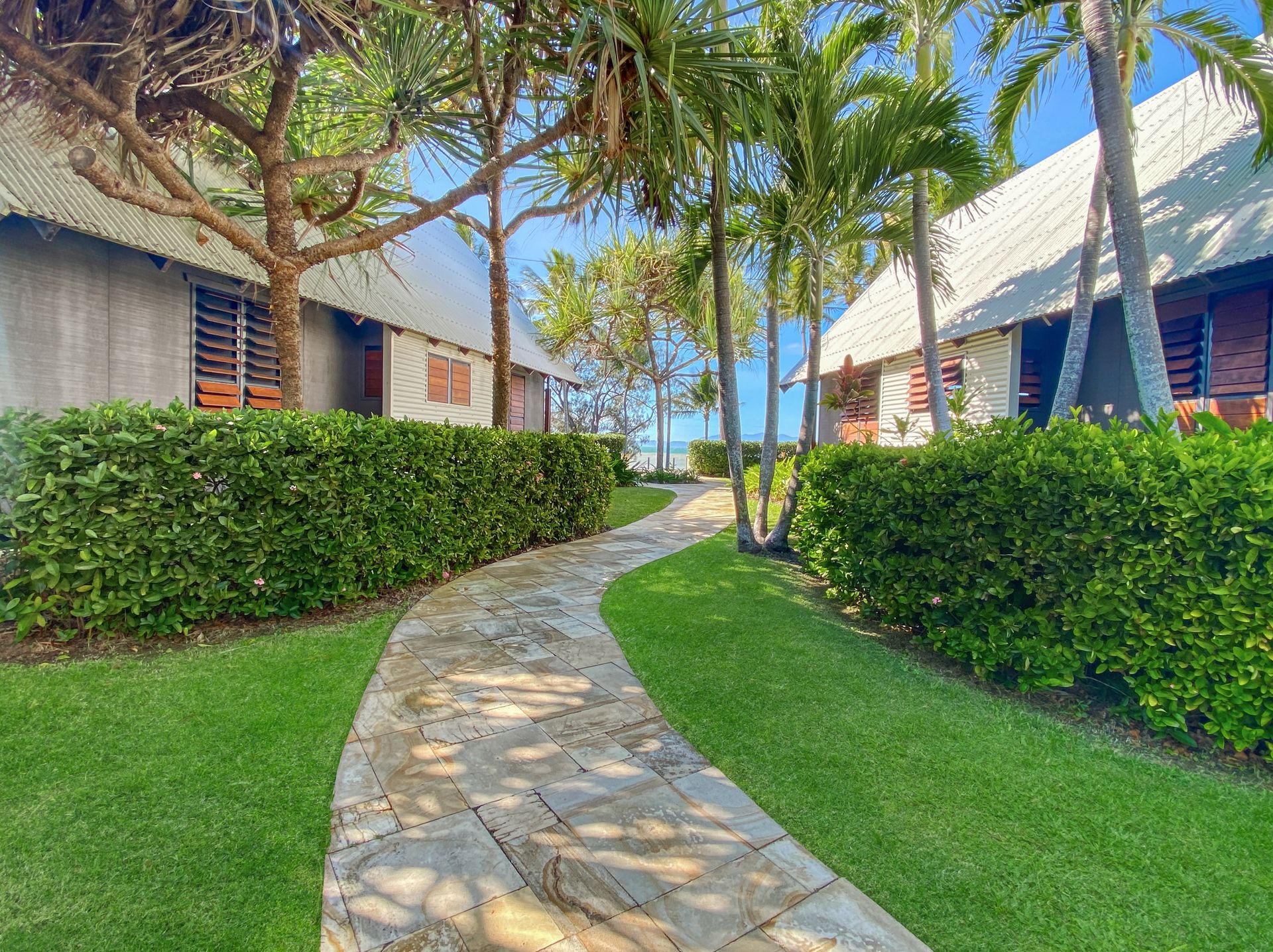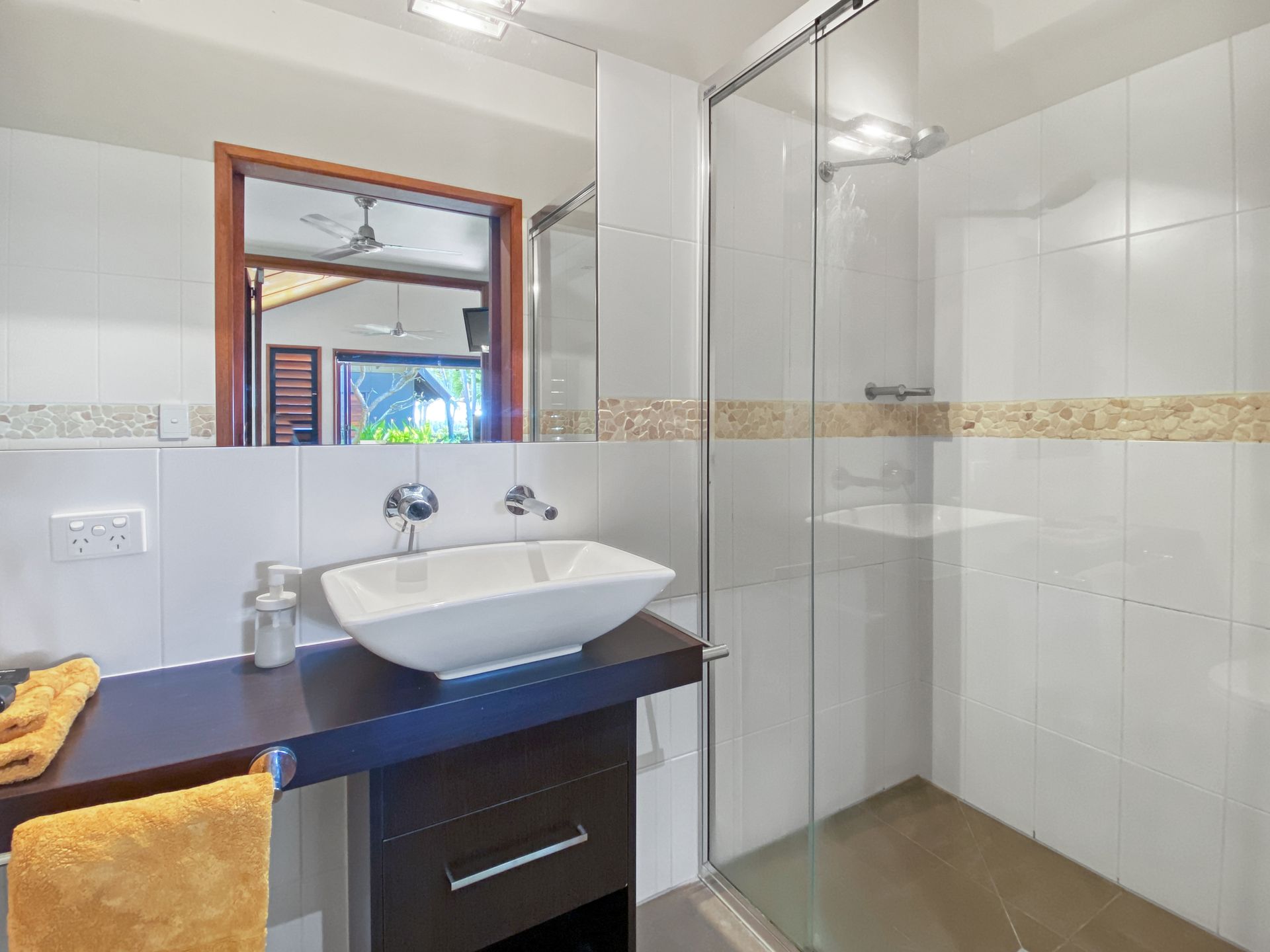 The living area has bifold panoramic doors opening on to your private covered verandah. Take the weight of the world off as you relax on cushioned lounges complete with foot stools, so you can really put your feet up. Alongside your private verandah is your own private tropical garden courtyard, featuring a four seater teak table chairs and your own private BBQ, ideal for outdoor dining or relaxing on your tropical island getaway. The villas share a swimming pool in the centre of the complex.